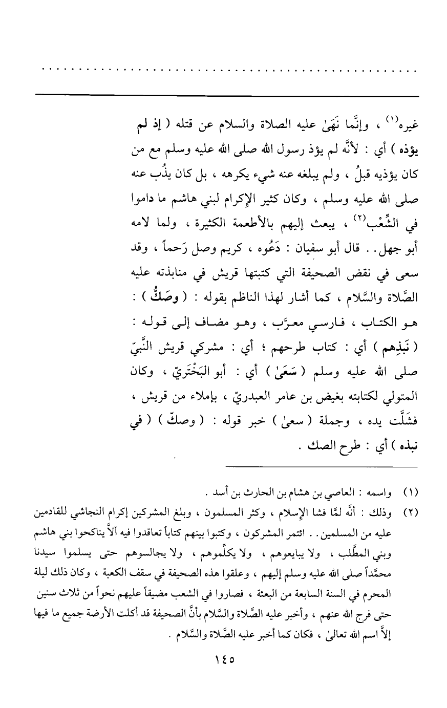 (2) وذلك: أنّه لمّا فشا الإسلام، وكثر المسلمون، وبلغ المشركين إكرام النجاشي للقادمين عليه من المسلمين.. ائتمر المشركون، وكتبوا بينهم كتابا تعاقدوا فيه ألّا يناكحوا بني هاشم وبني المطّلب، ولا يبايعوهم، ولا يكلّموهم، ولا يجالسوهم حتى يسلموا سيدنا محمّدا صلى الله عليه وسلم إليهم، وعلقوا هذه الصحيفة في سقف الكعبة، وكان ذلك ليلة المحرم في السنة السابعة من البعثة، فصاروا في الشعب مضيقا عليهم نحوا من ثلاث سنين حتى فرج الله عنهم، وأخبر عليه الصّلاة والسّلام بأنّ الصحيفة قد أكلت الأرضة جميع ما فيها إلّا اسم الله تعالى، فكان كما أخبر عليه الصّلاة والسّلام.