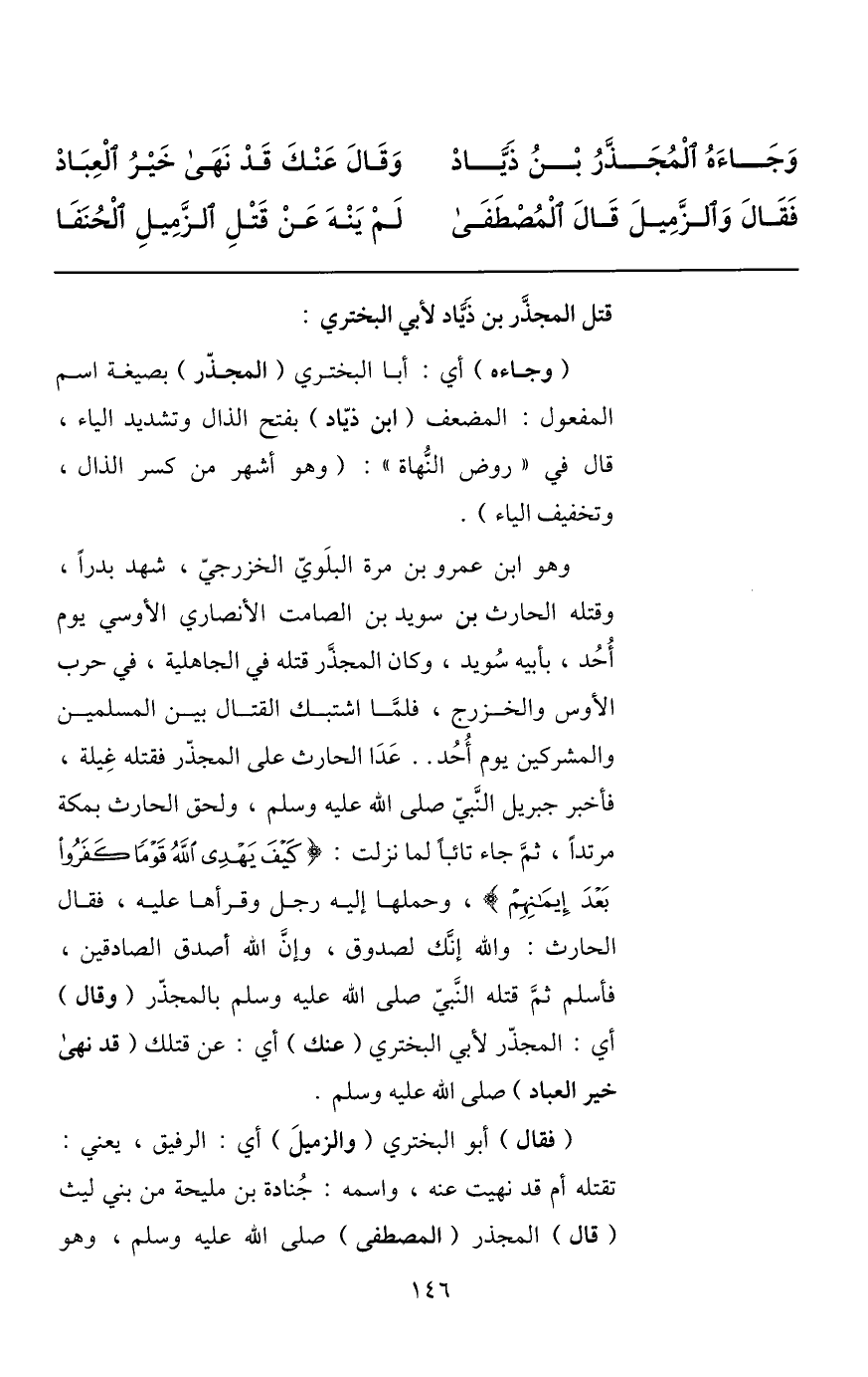 وهو ابن عمرو بن مرة البلويّ الخزرجيّ، شهد بدرا، وقتله الحارث بن سويد بن الصامت الأنصاري الأوسي يوم أحد، بأبيه سويد، وكان المجذّر قتله في الجاهلية، في حرب الأوس والخزرج، فلمّا اشتبك القتال بين المسلمين والمشركين يوم أحد.. عدا الحارث على المجذّر فقتله غيلة، فأخبر جبريل النّبيّ صلى الله عليه وسلم، ولحق الحارث بمكة مرتدا، ثمّ جاء تائبا لما نزلت: كَيْفَ يَهْدِي اللَّهُ قَوْماً كَفَرُوا بَعْدَ إِيمانِهِمْ، وحملها إليه رجل وقرأها عليه، فقال الحارث: والله إنّك لصدوق، وإنّ الله أصدق الصادقين، فأسلم ثمّ قتله النّبيّ صلى الله عليه وسلم بالمجذّر (وقال) أي: المجذّر لأبي البختري (عنك) أي: عن قتلك (قد نهى خير العباد) صلى الله عليه وسلم.