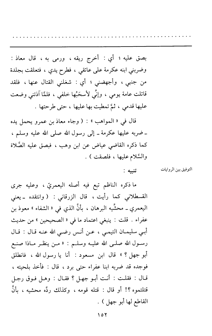ما ذكره الناظم تبع فيه أصله اليعمريّ، وعليه جرى القسطلاني كما رأيت، قال الزرقاني: (وانتقده- يعني اليعمري- محشّيه البرهان، بأنّ الذي في «الشفاء» معوذ بن عفراء. قلت: ينبغي اعتماد ما في «الصحيحين» من حديث أبي سليمان التيمي، عن أنس رضي الله عنه قال: قال رسول الله صلى الله عليه وسلم: «من ينظر ماذا صنع أبو جهل؟» قال ابن مسعود: أنا يا رسول الله، فانطلق فوجده قد ضربه ابنا عفراء حتى برد، قال: فأخذ بلحيته، قال: فقلت: أنت أبو جهل؟ فقال: وهل فوق رجل قتلتموه؟! أو قال: قتله قومه، وكذلك ردّه محشيه، بأنّ القاطع لها أبو جهل) .