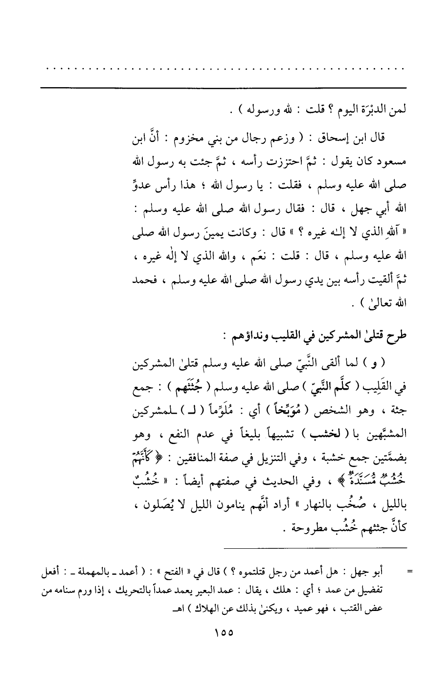 (و) لما ألقى النّبيّ صلى الله عليه وسلم قتلى المشركين في القليب (كلّم النّبيّ) صلى الله عليه وسلم (جثثهم) : جمع جثة، وهو الشخص (موبّخا) أي: ملوّما (ل) - لمشركين المشبّهين با (لخشب) تشبيها بليغا في عدم النفع، وهو بضمّتين جمع خشبة، وفي التنزيل في صفة المنافقين: كَأَنَّهُمْ خُشُبٌ مُسَنَّدَةٌ، وفي الحديث في صفتهم أيضا: «خشب بالليل، صخب بالنهار» أراد أنّهم ينامون الليل لا يصلون، كأنّ جثثهم خشب مطروحة.