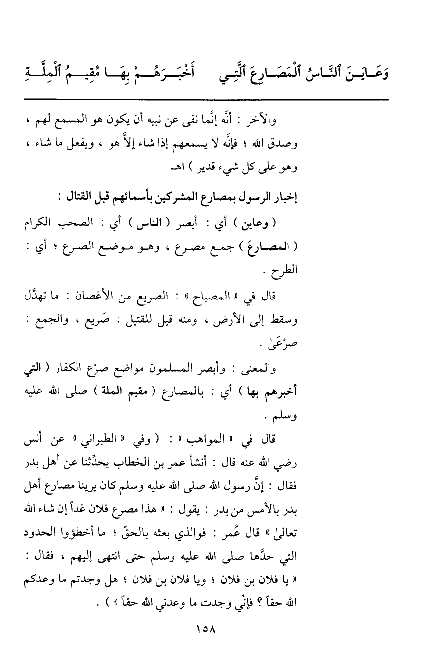 قال في «المواهب» : (وفي «الطبراني» عن أنس رضي الله عنه قال: أنشأ عمر بن الخطاب يحدّثنا عن أهل بدر فقال: إنّ رسول الله صلى الله عليه وسلم كان يرينا مصارع أهل بدر بالأمس من بدر: يقول: «هذا مصرع فلان غدا إن شاء الله تعالى» قال عمر: فو الذي بعثه بالحقّ؛ ما أخطؤوا الحدود التي حدّها صلى الله عليه وسلم حتى انتهى إليهم، فقال: