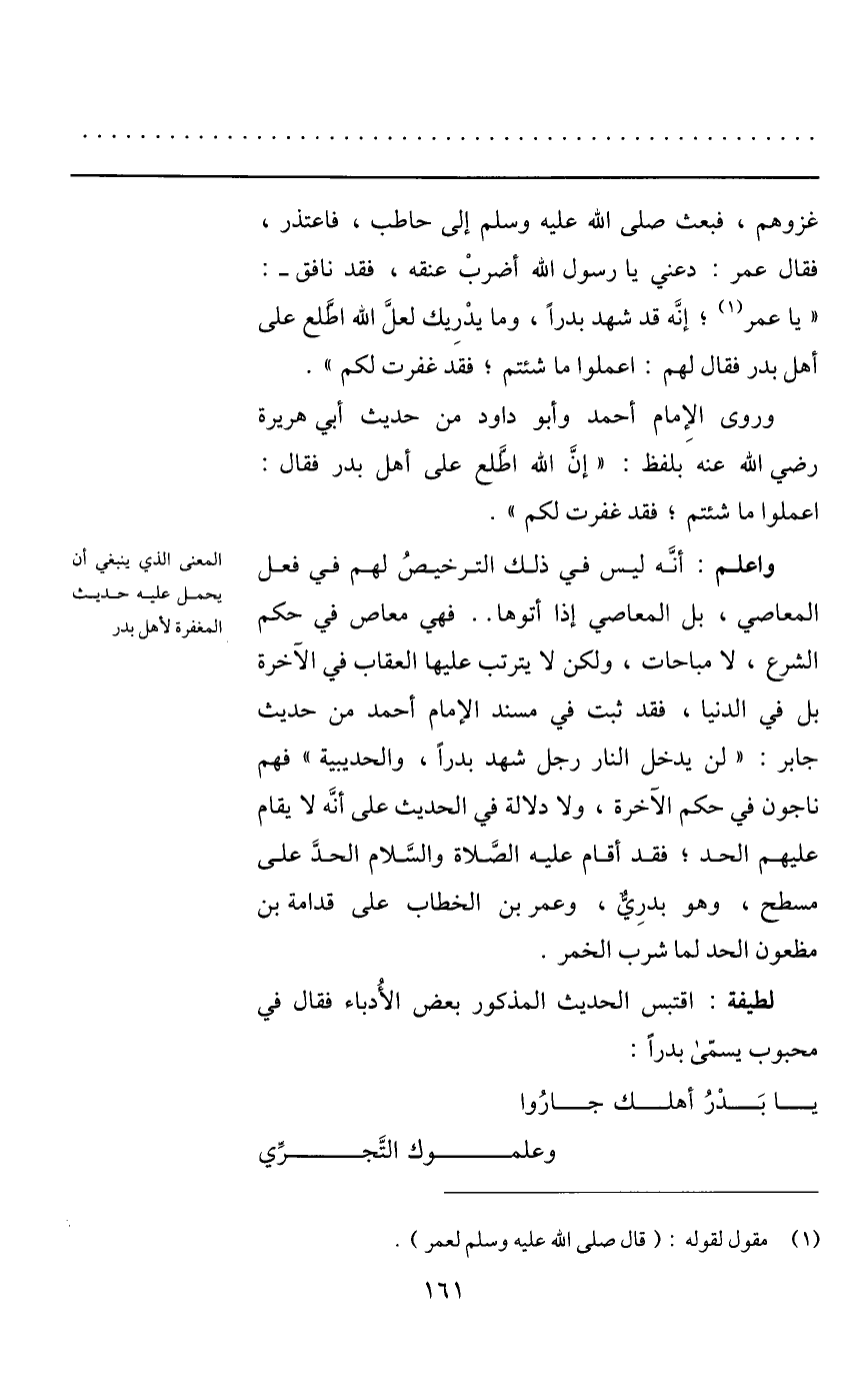 «يا عمر «1» ؛ إنّه قد شهد بدرا، وما يدريك لعلّ الله اطّلع على أهل بدر فقال لهم: اعملوا ما شئتم؛ فقد غفرت لكم» .