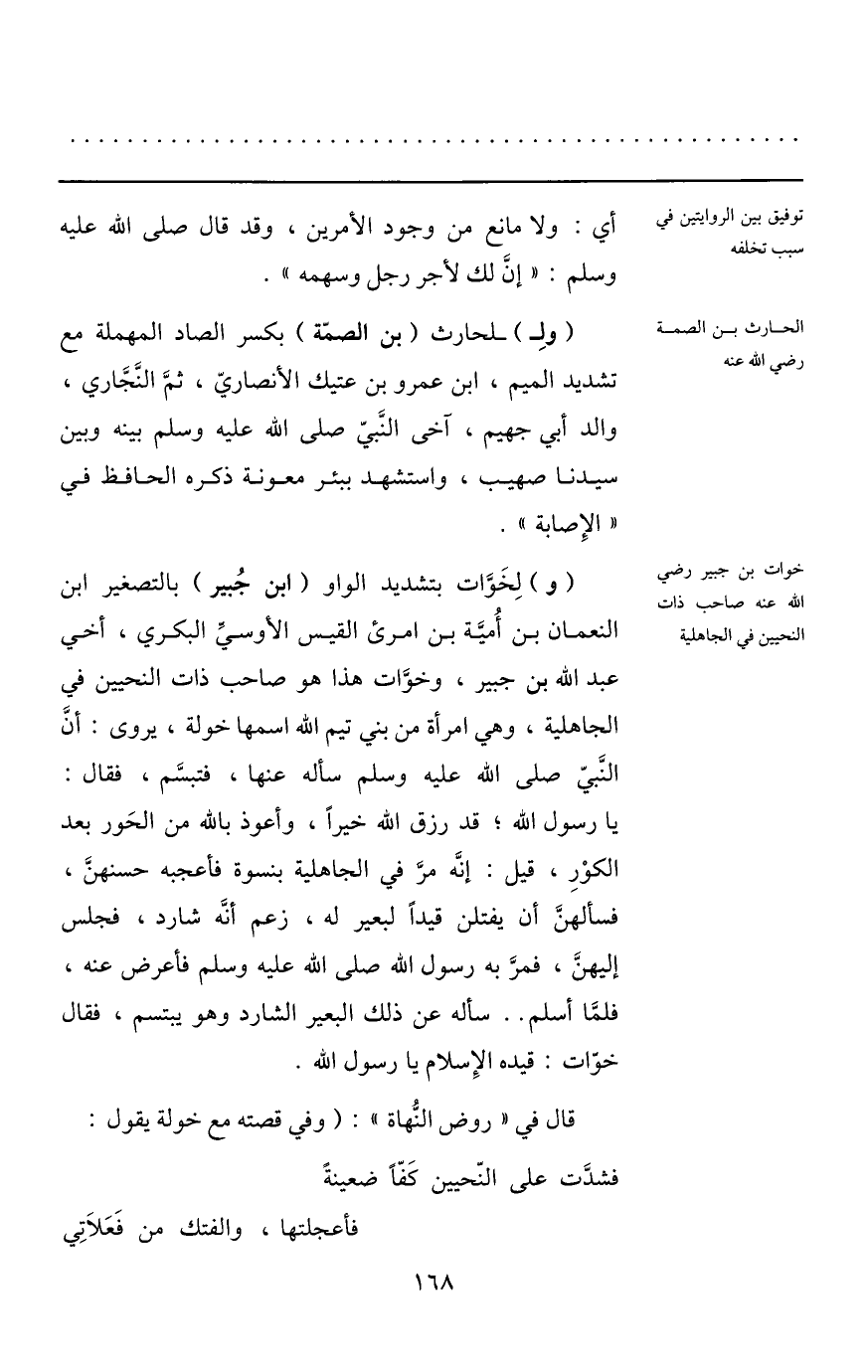 (ول) لحارث (بن الصمّة) بكسر الصاد المهملة مع تشديد الميم، ابن عمرو بن عتيك الأنصاريّ، ثمّ النّجّاري، والد أبي جهيم، آخى النّبيّ صلى الله عليه وسلم بينه وبين سيدنا صهيب، واستشهد ببئر معونة ذكره الحافظ في «الإصابة» .