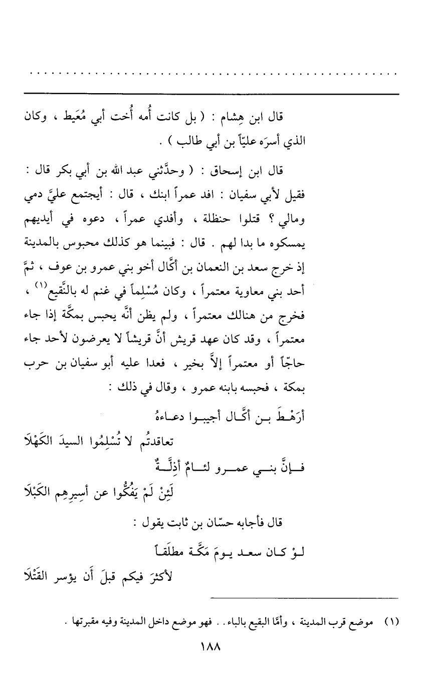 فقيل لأبي سفيان: افد عمرا ابنك، قال: أيجتمع عليّ دمي ومالي؟ قتلوا حنظلة، وأفدي عمرا، دعوه في أيديهم يمسكوه ما بدا لهم. قال: فبينما هو كذلك محبوس بالمدينة إذ خرج سعد بن النعمان بن أكّال أخو بني عمرو بن عوف، ثمّ أحد بني معاوية معتمرا، وكان مسلما في غنم له بالنّقيع «1» ، فخرج من هنا لك معتمرا، ولم يظن أنّه يحبس بمكّة إذا جاء معتمرا، وقد كان عهد قريش أنّ قريشا لا يعرضون لأحد جاء حاجّا أو معتمرا إلّا بخير، فعدا عليه أبو سفيان بن حرب بمكة، فحبسه بابنه عمرو، وقال في ذلك: