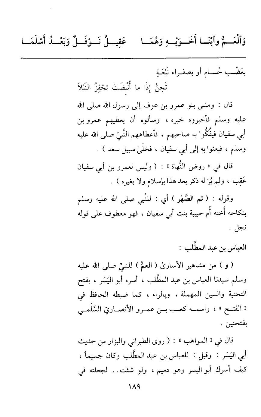 (و) من مشاهير الأسارى (العمّ) للنبيّ صلى الله عليه وسلم سيدنا العباس بن عبد المطّلب، أسره أبو اليسر، بفتح التحتية والسين المهملة، وبالراء، كما ضبطه الحافظ في «الفتح» ، واسمه كعب بن عمرو الأنصاريّ السّلمي بفتحتين.