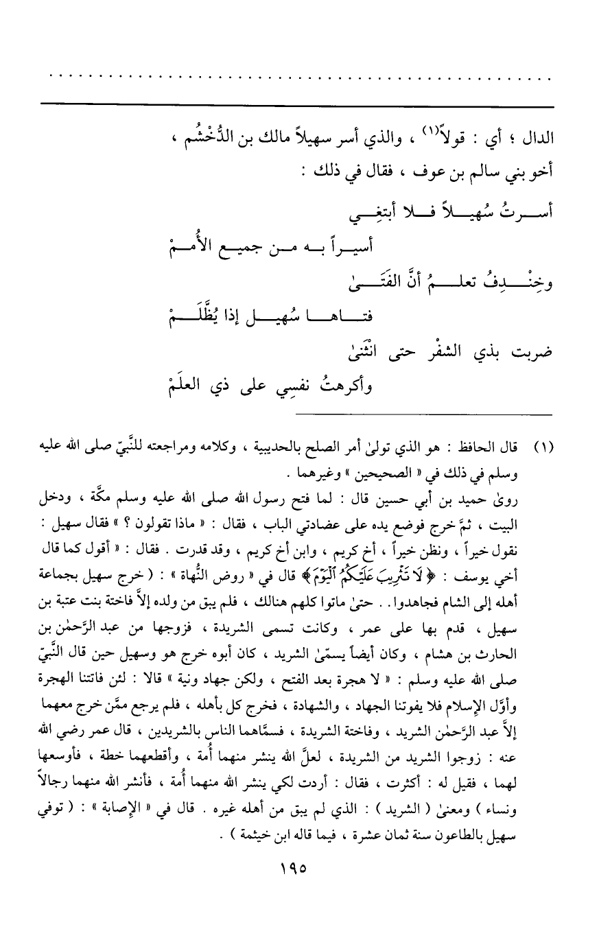 (1) قال الحافظ: هو الذي تولى أمر الصلح بالحديبية، وكلامه ومراجعته للنّبيّ صلى الله عليه وسلم في ذلك في «الصحيحين» وغيرهما. روى حميد بن أبي حسين قال: لما فتح رسول الله صلى الله عليه وسلم مكّة، ودخل البيت، ثمّ خرج فوضع يده على عضادتي الباب، فقال: «ماذا تقولون؟» فقال سهيل: نقول خيرا، ونظن خيرا، أخ كريم، وابن أخ كريم، وقد قدرت. فقال: «أقول كما قال أخي يوسف: لا تَثْرِيبَ عَلَيْكُمُ الْيَوْمَ قال في «روض النّهاة» : (خرج سهيل بجماعة أهله إلى الشام فجاهدوا.. حتى ماتوا كلهم هنا لك، فلم يبق من ولده إلّا فاختة بنت عتبة بن سهيل، قدم بها على عمر، وكانت تسمى الشريدة، فزوجها من عبد الرّحمن بن الحارث بن هشام، وكان أيضا يسمّى الشريد، كان أبوه خرج هو وسهيل حين قال النّبيّ صلى الله عليه وسلم: «لا هجرة بعد الفتح، ولكن جهاد ونية» قالا: لئن فاتتنا الهجرة وأوّل الإسلام فلا يفوتنا الجهاد، والشهادة، فخرج كل بأهله، فلم يرجع ممّن خرج معهما إلّا عبد الرّحمن الشريد، وفاختة الشريدة، فسمّاهما الناس بالشريدين، قال عمر رضي الله عنه: زوجوا الشريد من الشريدة، لعلّ الله ينشر منهما أمة، وأقطعهما خطة، فأوسعها لهما، فقيل له: أكثرت، فقال: أردت لكي ينشر الله منهما أمة، فأنشر الله منهما رجالا ونساء) ومعنى (الشريد) : الذي لم يبق من أهله غيره. قال في «الإصابة» : (توفي سهيل بالطاعون سنة ثمان عشرة، فيما قاله ابن خيثمة) .