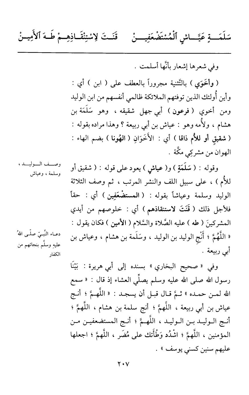 وقوله: (سلمة) و (عياش) يعود على قوله: (شقيق أو للأم) ، على سبيل اللف والنشر المرتب، ثم وصف الثلاثة الوليد وسلمة وعياشا بقوله: (المستضعفين) أي: حقا فلأجل ذلك (قنت لاستنقاذهم) أي: خلوصهم من أيدي المشركين (طه) عليه الصّلاة والسّلام (الأمين) فكان يقول: