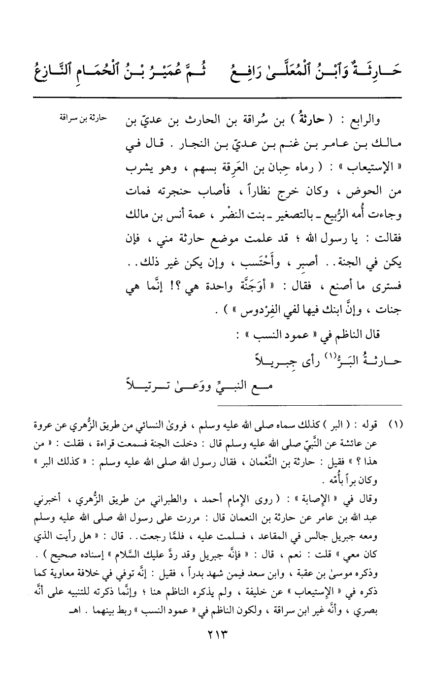 (1) قوله: (البر) كذلك سماه صلى الله عليه وسلم، فروى النسائي من طريق الزّهري عن عروة عن عائشة عن النّبيّ صلى الله عليه وسلم قال: دخلت الجنة فسمعت قراءة، فقلت: «من هذا؟» فقيل: حارثة بن النّعمان، فقال رسول الله صلى الله عليه وسلم: «كذلك البر» وكان برا بأمّه. وقال في «الإصابة» : (روى الإمام أحمد، والطبراني من طريق الزّهري، أخبرني عبد الله بن عامر عن حارثة بن النعمان قال: مررت على رسول الله صلى الله عليه وسلم ومعه جبريل جالس في المقاعد، فسلمت عليه، فلمّا رجعت.. قال: «هل رأيت الذي كان معي» قلت: نعم، قال: «فإنّه جبريل وقد ردّ عليك السّلام» إسناده صحيح) . وذكره موسى بن عقبة، وابن سعد فيمن شهد بدرا، فقيل: إنّه توفي في خلافة معاوية كما ذكره في «الإستيعاب» عن خليفة، ولم يذكره الناظم هنا؛ وإنّما ذكرته للتنبيه على أنّه بصري، وأنّه غير ابن سراقة، ولكون الناظم في «عمود النسب» ربط بينهما. اهـ