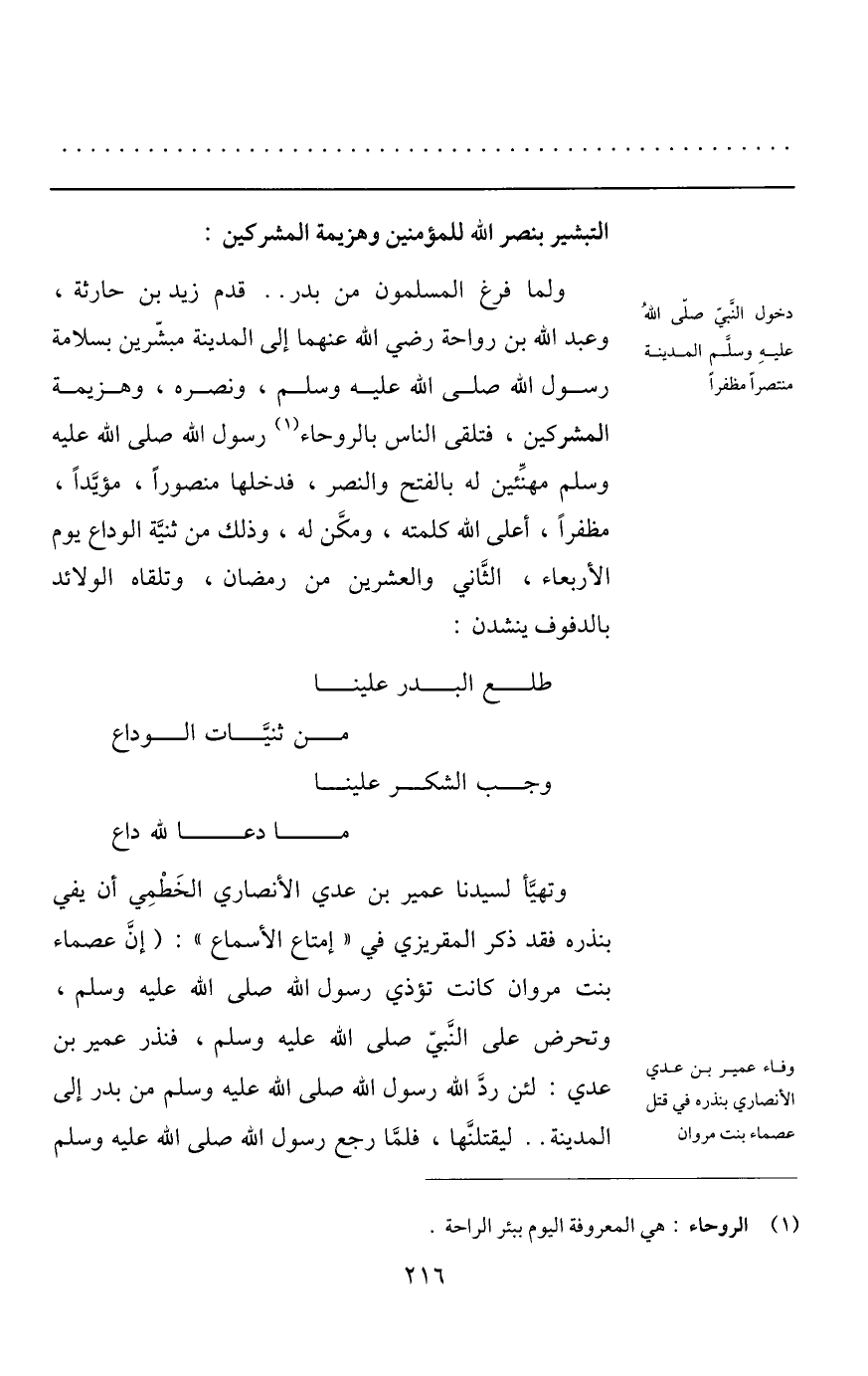 ولما فرغ المسلمون من بدر.. قدم زيد بن حارثة، وعبد الله بن رواحة رضي الله عنهما إلى المدينة مبشّرين بسلامة رسول الله صلى الله عليه وسلم، ونصره، وهزيمة المشركين، فتلقى الناس بالروحاء «1» رسول الله صلى الله عليه وسلم مهنّئين له بالفتح والنصر، فدخلها منصورا، مؤيّدا، مظفرا، أعلى الله كلمته، ومكّن له، وذلك من ثنيّة الوداع يوم الأربعاء، الثّاني والعشرين من رمضان، وتلقاه الولائد بالدفوف ينشدن: