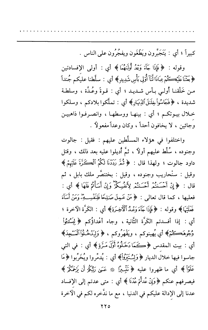 واختلفوا في هؤلاء المسلّطين عليهم: فقيل: جالوت وجنوده، سلّط عليهم أولا، ثمّ اديلوا عليه بعد ذلك، وقتل داود جالوت؛ ولهذا قال: ثُمَّ رَدَدْنا لَكُمُ الْكَرَّةَ عَلَيْهِمْ وقيل: سنحاريب وجنوده، وقيل: بختنصّر ملك بابل، ثم قال: إِنْ أَحْسَنْتُمْ أَحْسَنْتُمْ لِأَنْفُسِكُمْ وَإِنْ أَسَأْتُمْ فَلَها أي: