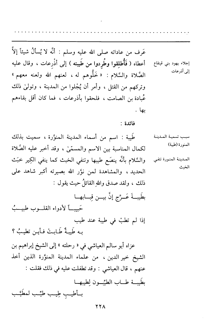 عرف من عاداته صلى الله عليه وسلم: أنّه لا يسأل شيئا إلّا أعطاه (فأطلقوا وطردوا من طيبته) إلى أذرعات، وقال عليه الصّلاة والسّلام: «خلّوهم له، لعنهم الله ولعنه معهم» وتركهم من القتل، وأمر أن يجلوا من المدينة، وتولى ذلك عبادة بن الصامت، فلحقوا بأذرعات، فما كان أقل بقاءهم بها.
