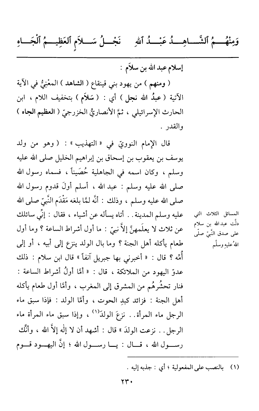 (ومنهم) من يهود بني قينقاع (الشاهد) المعنيّ في الآية الآتية (عبد الله نجل) أي: (سلام) بتخفيف اللام، ابن الحارث الإسرائيلي، ثمّ الأنصاريّ الخزرجيّ (العظيم الجاه) والقدر.