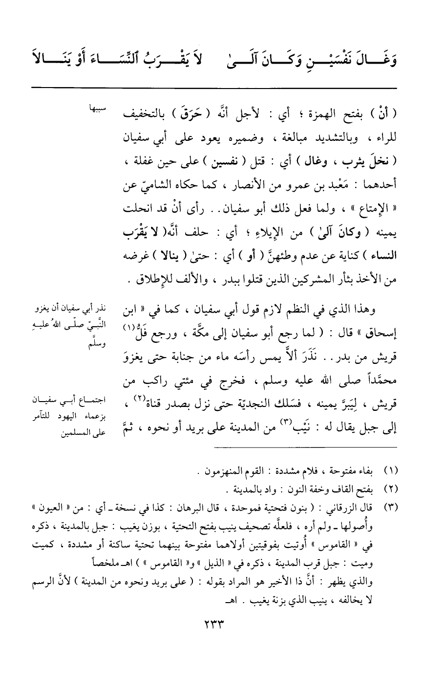 وهذا الذي في النظم لازم قول أبي سفيان، كما في «ابن إسحاق» قال: (لما رجع أبو سفيان إلى مكّة، ورجع فلّ «1» قريش من بدر.. نذر ألّا يمس رأسه ماء من جنابة حتى يغزو محمّدا صلى الله عليه وسلم، فخرج في مئتي راكب من قريش، ليبرّ يمينه، فسلك النجديّة حتى نزل بصدر قناة «2» ، إلى جبل يقال له: نيب «3» من المدينة على بريد أو نحوه، ثمّ
