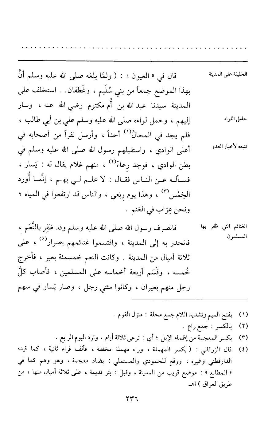 قال في «العيون» : (ولمّا بلغه صلى الله عليه وسلم أنّ بهذا الموضع جمعا من بني سليم، وغطفان.. استخلف على المدينة سيدنا عبد الله بن أم مكتوم رضي الله عنه، وسار إليهم، وحمل لواءه صلى الله عليه وسلم علي بن أبي طالب، فلم يجد في المحالّ «1» أحدا، وأرسل نفرا من أصحابه في أعلى الوادي، واستقبلهم رسول الله صلى الله عليه وسلم في بطن الوادي، فوجد رعاء «2» ، منهم غلام يقال له: يسار، فسأله عن الناس فقال: لا علم لي بهم، إنّما أورد الخمس «3» ، وهذا يوم ربعي، والناس قد ارتفعوا في المياه؛ ونحن عزاب في الغنم.