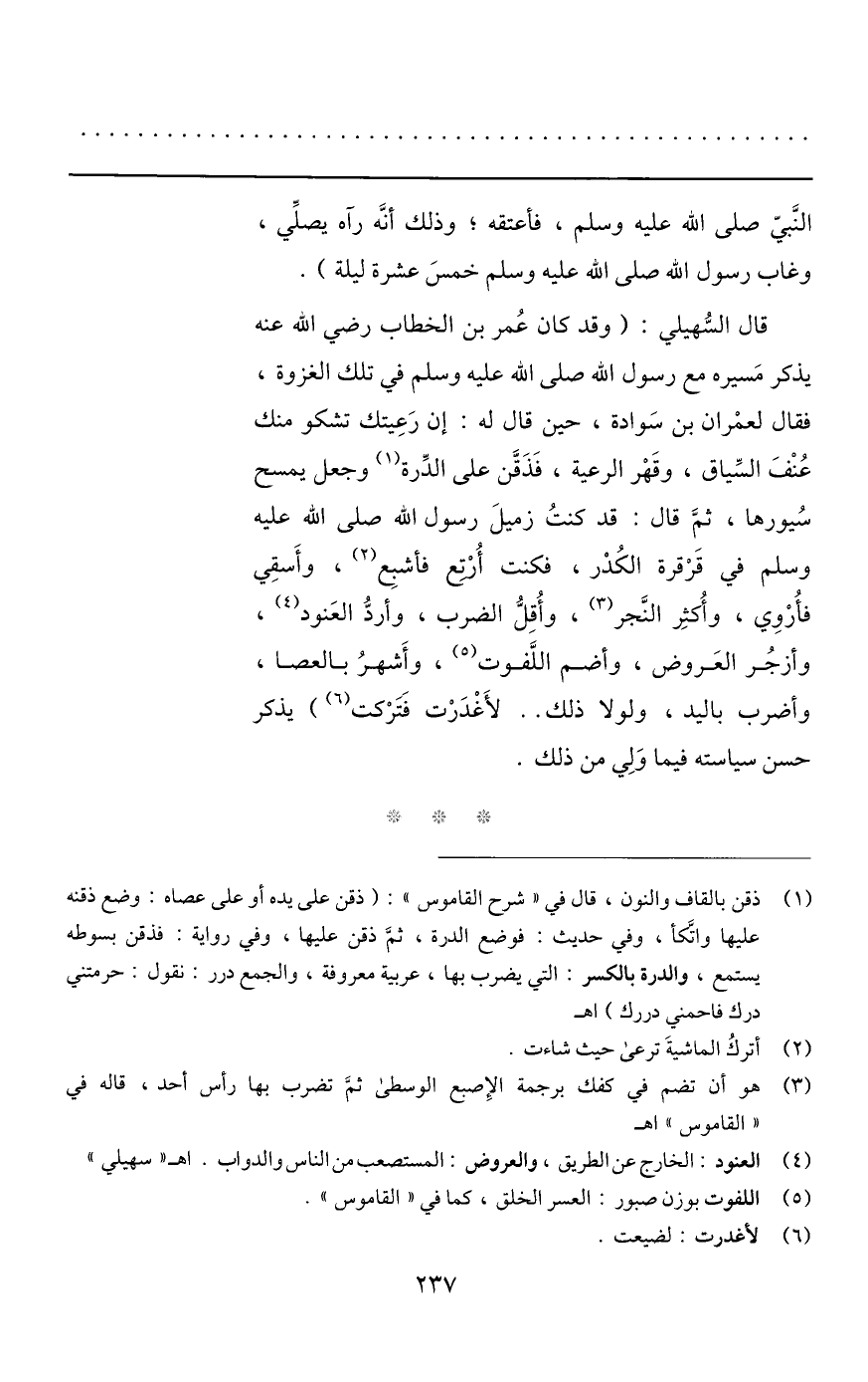 قال السّهيلي: (وقد كان عمر بن الخطاب رضي الله عنه يذكر مسيره مع رسول الله صلى الله عليه وسلم في تلك الغزوة، فقال لعمران بن سوادة، حين قال له: إن رعيتك تشكو منك عنف السّياق، وقهر الرعية، فذقّن على الدّرة «1» وجعل يمسح سيورها، ثمّ قال: قد كنت زميل رسول الله صلى الله عليه وسلم في قرقرة الكدر، فكنت أرتع فأشبع «2» ، وأسقي فأروي، وأكثر النّجر «3» ، وأقلّ الضرب، وأردّ العنود «4» ، وأزجر العروض، وأضم اللّفوت «5» ، وأشهر بالعصا، وأضرب باليد، ولولا ذلك.. لأغدرت فتركت «6» ) يذكر حسن سياسته فيما ولي من ذلك.