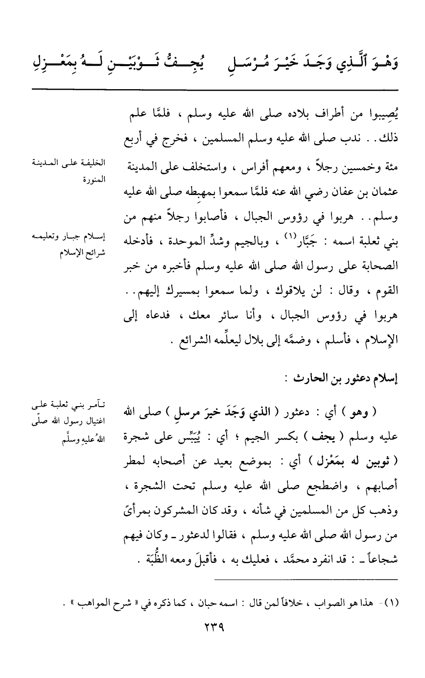 يصيبوا من أطراف بلاده صلى الله عليه وسلم، فلمّا علم ذلك.. ندب صلى الله عليه وسلم المسلمين، فخرج في أربع مئة وخمسين رجلا، ومعهم أفراس، واستخلف على المدينة عثمان بن عفان رضي الله عنه فلمّا سمعوا بمهبطه صلى الله عليه وسلم.. هربوا في رؤوس الجبال، فأصابوا رجلا منهم من بني ثعلبة اسمه: جبّار «1» ، وبالجيم وشدّ الموحدة، فأدخله الصحابة على رسول الله صلى الله عليه وسلم فأخبره من خبر القوم، وقال: لن يلاقوك، ولما سمعوا بمسيرك إليهم..