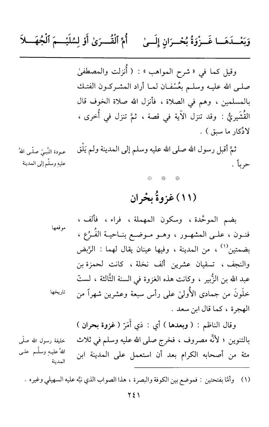 وقال الناظم: (وبعدها) أي: ذي أمرّ (غزوة بحران) بالتنوين؛ لأنّه مصروف، فخرج صلى الله عليه وسلم في ثلاث مئة من أصحابه الكرام بعد أن استعمل على المدينة ابن