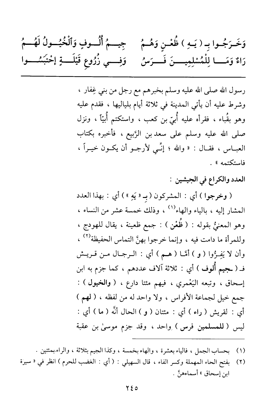 ، وذلك خمسة عشر من النساء، وهو المعنيّ بقوله: (ظعن) : جمع ظعينة، يقال للهودج، وللمرأة ما دامت فيه، وإنما خرجوا بهنّ التماس الحفيظة «2» ، وأن لا يفرّوا (و) أمّا (هم) أي: الرجال من قريش ف (جيم ألوف) أي: ثلاثة آلاف عددهم، كما جزم به ابن إسحاق، وتبعه اليعمري، فيهم مئتا دارع، (والخيول) :