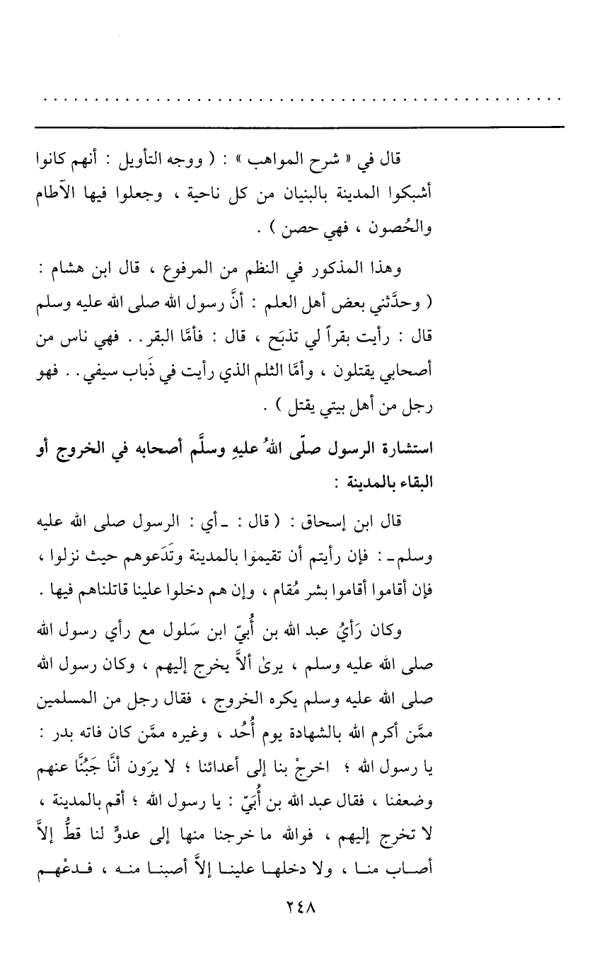 قال ابن إسحاق: (قال: - أي: الرسول صلى الله عليه وسلم-: فإن رأيتم أن تقيموا بالمدينة وتدعوهم حيث نزلوا، فإن أقاموا أقاموا بشر مقام، وإن هم دخلوا علينا قاتلناهم فيها.