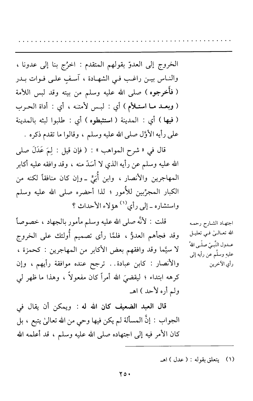 قلت: لأنّه صلى الله عليه وسلم مأمور بالجهاد، خصوصا وقد فجأهم العدوّ، فلمّا رأى تصميم أولئك على الخروج لا سيّما وقد وافقهم بعض الأكابر من المهاجرين: كحمزة، والأنصار: كابن عبادة.. ترجح عنده موافقة رأيهم، وإن كرهه ابتداء؛ ليقضي الله أمرا كان مفعولا، وهذا ما ظهر لي ولم أره لأحد) اهـ