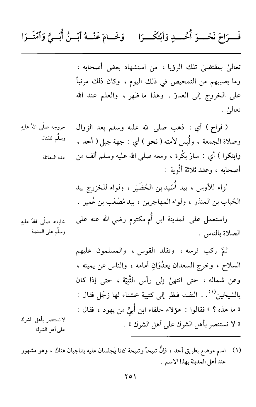 (فراح) أي: ذهب صلى الله عليه وسلم بعد الزوال وصلاة الجمعة، ولبس لأمته (نحو) أي: جهة جبل (أحد، وابتكرا) أي: سار بكرة، ومعه صلى الله عليه وسلم ألف من أصحابه، وعقد ثلاثة ألوية: