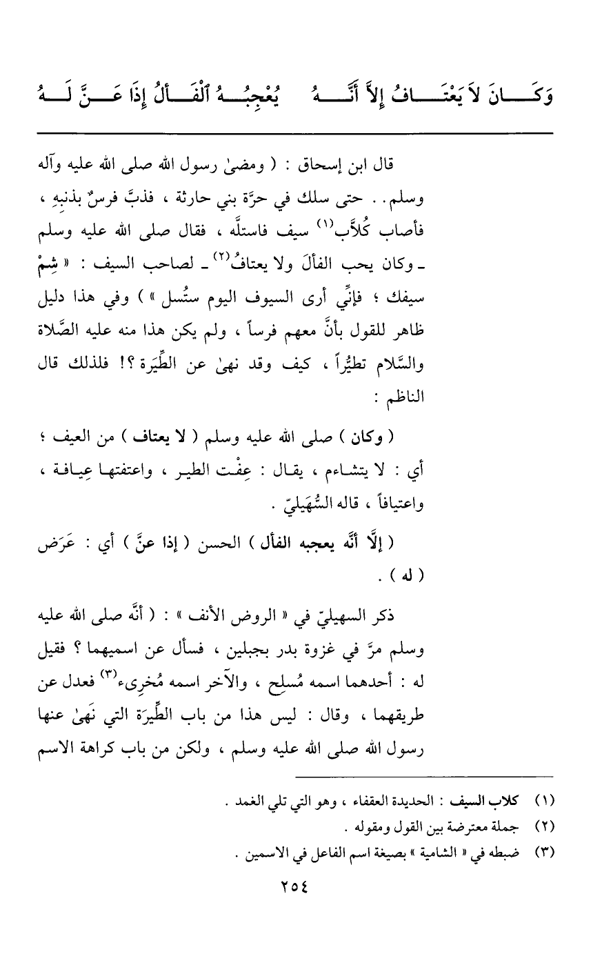 قال ابن إسحاق: (ومضى رسول الله صلى الله عليه وآله وسلم.. حتى سلك في حرّة بني حارثة، فذبّ فرس بذنبه، فأصاب كلّاب «1» سيف فاستلّه، فقال صلى الله عليه وسلم وكان يحب الفأل ولا يعتاف «2» - لصاحب السيف: «شم سيفك؛ فإنّي أرى السيوف اليوم ستسل» ) وفي هذا دليل ظاهر للقول بأنّ معهم فرسا، ولم يكن هذا منه عليه الصّلاة والسّلام تطيّرا، كيف وقد نهى عن الطّيرة؟! فلذلك قال الناظم: