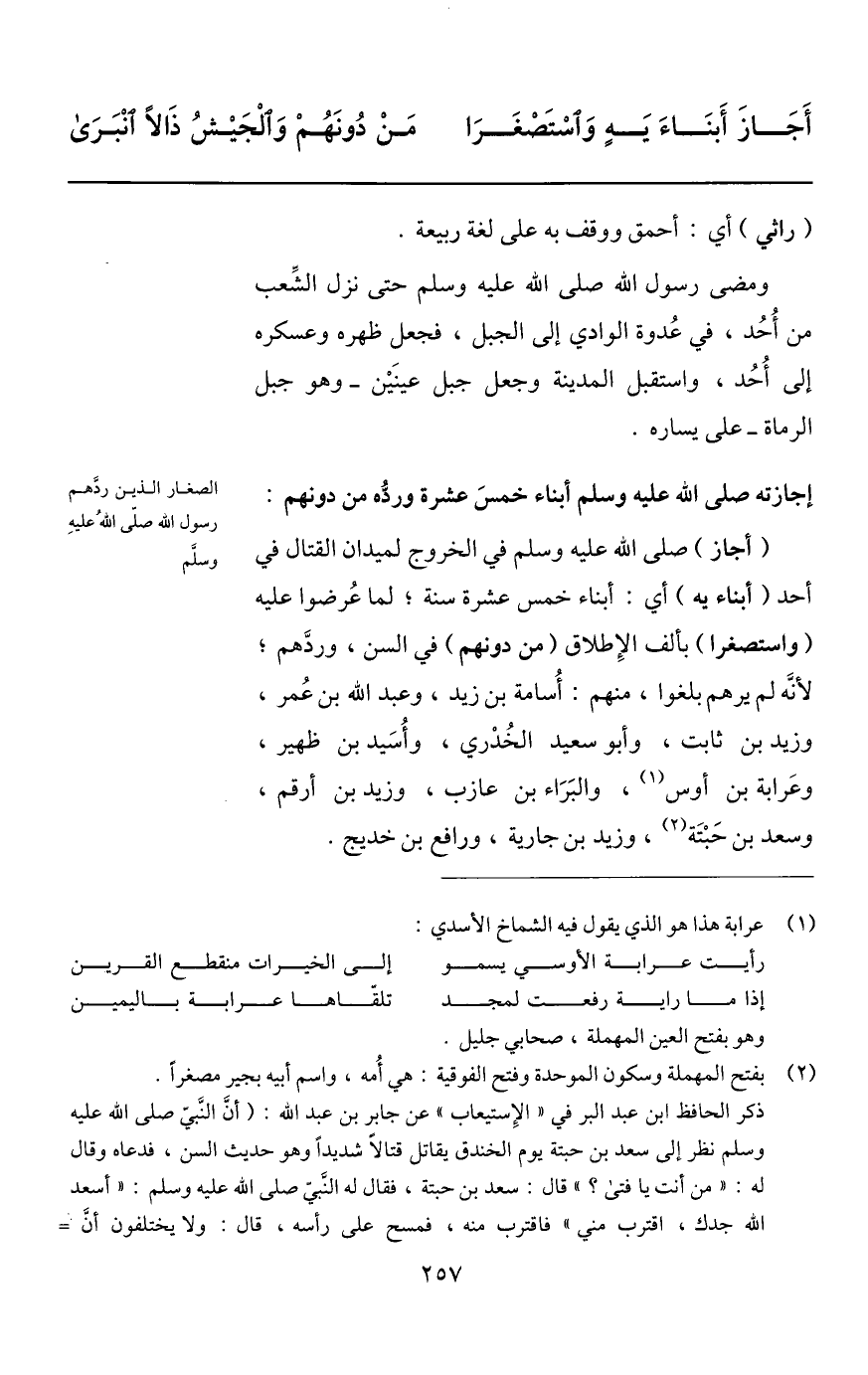 (أجاز) صلى الله عليه وسلم في الخروج لميدان القتال في أحد (أبناءيه) أي: أبناء خمس عشرة سنة؛ لما عرضوا عليه (واستصغرا) بألف الإطلاق (من دونهم) في السن، وردّهم؛ لأنّه لم يرهم بلغوا، منهم: أسامة بن زيد، وعبد الله بن عمر، وزيد بن ثابت، وأبو سعيد الخدري، وأسيد بن ظهير، وعرابة بن أوس «1» ، والبراء بن عازب، وزيد بن أرقم، وسعد بن حبتة «2» ، وزيد بن جارية، ورافع بن خديج.