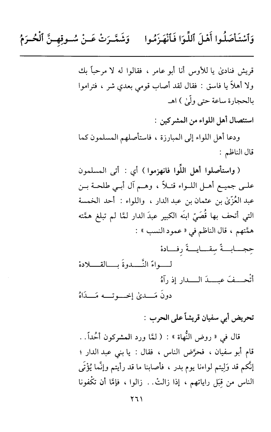 (واستأصلوا أهل اللّوا فانهزموا) أي: أتى المسلمون على جميع أهل اللواء قتلا، وهم آل أبي طلحة بن عبد العزّى بن عثمان بن عبد الدار، واللواء: أحد الخمسة التي أتحف بها قصيّ ابنه الكبير عبد الدار لمّا لم تبلغ همّته همّتهم، قال الناظم في «عمود النسب» :
