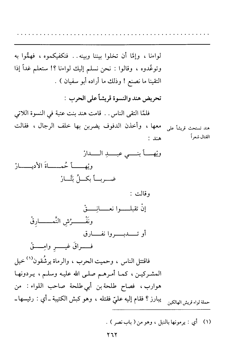 فلمّا التقى الناس.. قامت هند بنت عتبة في النسوة اللاتي معها، وأخذن الدفوف يضربن بها خلف الرجال، فقالت هند: