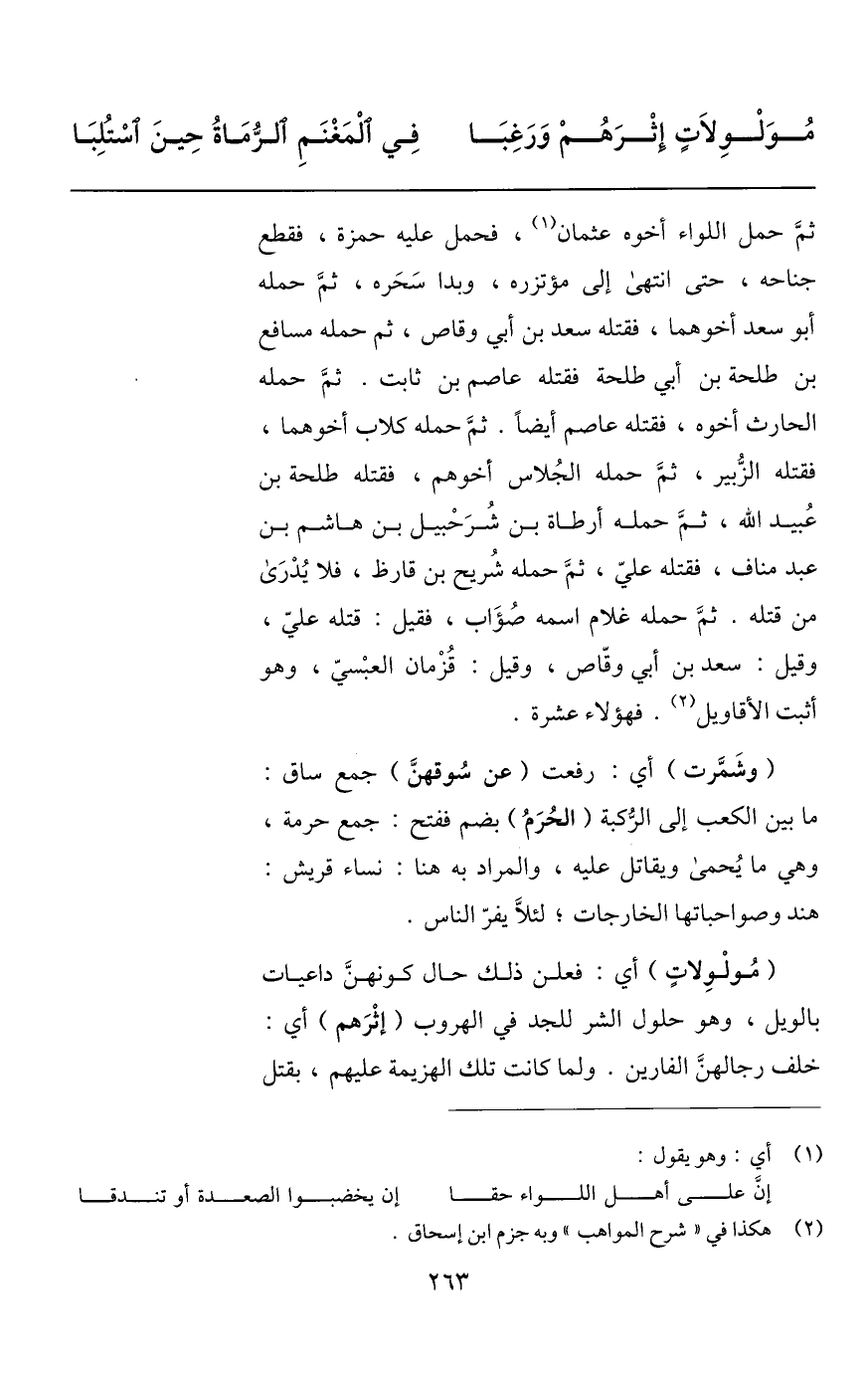 ثمّ حمل اللواء أخوه عثمان «1» ، فحمل عليه حمزة، فقطع جناحه، حتى انتهى إلى مؤتزره، وبدا سحره، ثمّ حمله أبو سعد أخوهما، فقتله سعد بن أبي وقاص، ثم حمله مسافع بن طلحة بن أبي طلحة فقتله عاصم بن ثابت. ثمّ حمله الحارث أخوه، فقتله عاصم أيضا. ثمّ حمله كلاب أخوهما، فقتله الزّبير، ثمّ حمله الجلاس أخوهم، فقتله طلحة بن عبيد الله، ثمّ حمله أرطاة بن شرحبيل بن هاشم بن عبد مناف، فقتله عليّ، ثمّ حمله شريح بن قارظ، فلا يدرى من قتله. ثمّ حمله غلام اسمه صؤاب، فقيل: قتله عليّ، وقيل: سعد بن أبي وقّاص، وقيل: قزمان العبسيّ، وهو أثبت الأقاويل «2» . فهؤلاء عشرة.