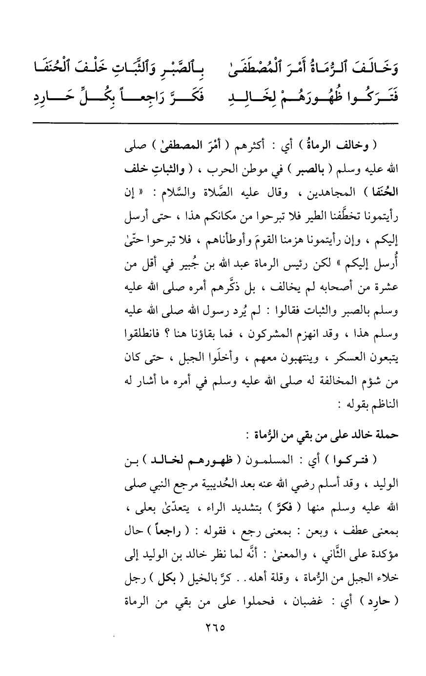 (فتركوا) أي: المسلمون (ظهورهم لخالد) بن الوليد، وقد أسلم رضي الله عنه بعد الحديبية مرجع النبي صلى الله عليه وسلم منها (فكرّ) بتشديد الراء، يتعدّى بعلى، بمعنى عطف، وبعن: بمعنى رجع، فقوله: (راجعا) حال مؤكدة على الثّاني، والمعنى: أنّه لما نظر خالد بن الوليد إلى خلاء الجبل من الرّماة، وقلة أهله.. كرّ بالخيل (بكل) رجل (حارد) أي: غضبان، فحملوا على من بقي من الرماة
