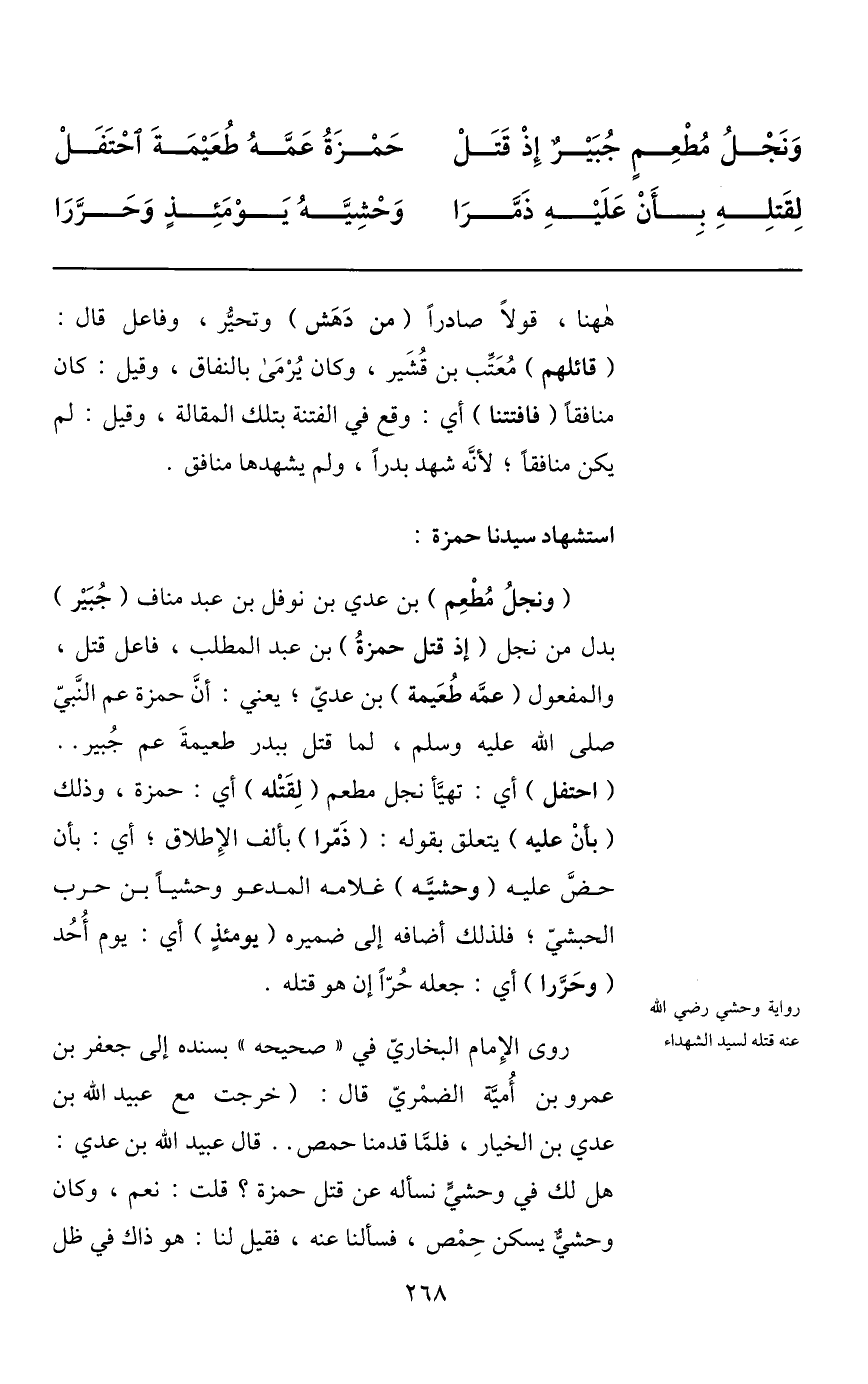 (احتفل) أي: تهيّأ نجل مطعم (لقتله) أي: حمزة، وذلك (بأن عليه) يتعلق بقوله: (ذمّرا) بألف الإطلاق؛ أي: بأن حضّ عليه (وحشيّه) غلامه المدعو وحشيا بن حرب الحبشيّ؛ فلذلك أضافه إلى ضميره (يومئذ) أي: يوم أحد (وحرّرا) أي: جعله حرّا إن هو قتله.