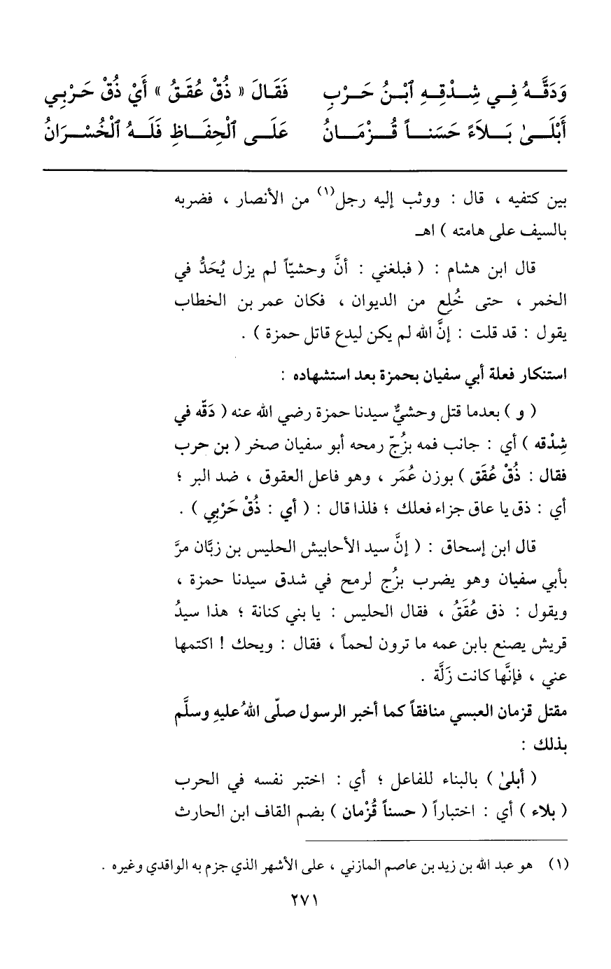 (و) بعد ما قتل وحشيّ سيدنا حمزة رضي الله عنه (دقّه في شدقه) أي: جانب فمه بزجّ رمحه أبو سفيان صخر (بن حرب فقال: ذق عقق) بوزن عمر، وهو فاعل العقوق، ضد البر؛ أي: ذق يا عاق جزاء فعلك؛ فلذا قال: (أي: ذق حربي) .