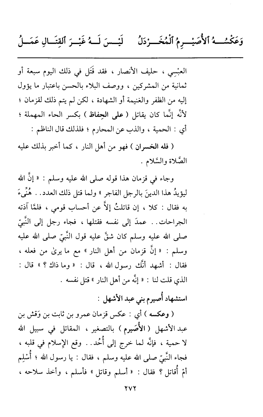 (وعكسه) أي: عكس قزمان عمرو بن ثابت بن وقش بن عبد الأشهل (الأصيرم) بالتصغير، المقاتل في سبيل الله لا حمية، فإنّه لما خرج إلى أحد.. وقع الإسلام في قلبه، فجاء النّبيّ صلى الله عليه وسلم، فقال: يا رسول الله؛ أسلم أم أقاتل؟ فقال: «أسلم وقاتل» فأسلم، وأخذ سلاحه،