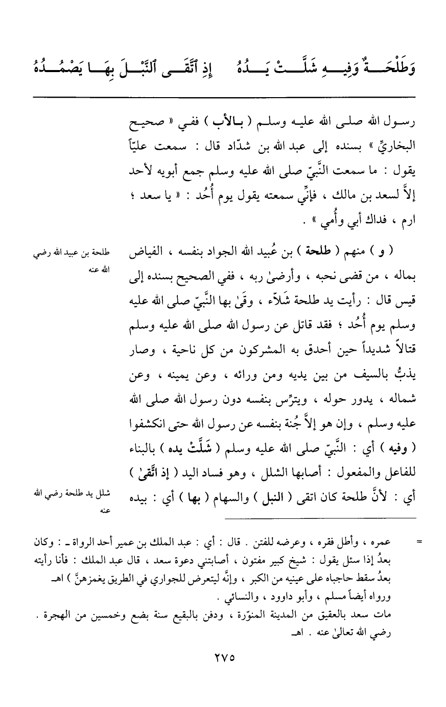 وطلحة وفيه شلّت يده ... إذ اتّقى النّبل بها يصمده