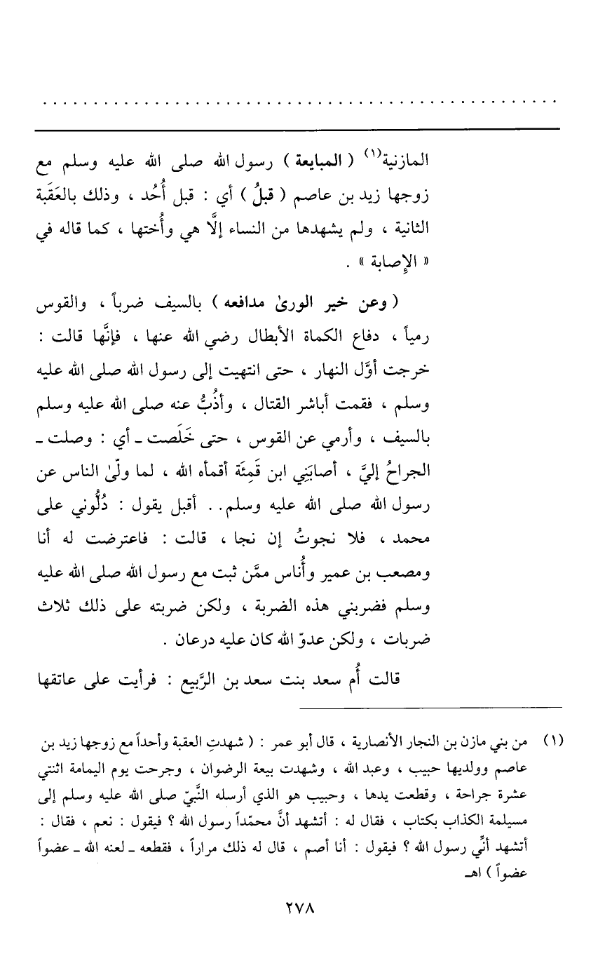 المازنية «1» (المبايعة) رسول الله صلى الله عليه وسلم مع زوجها زيد بن عاصم (قبل) أي: قبل أحد، وذلك بالعقبة الثانية، ولم يشهدها من النساء إلّا هي وأختها، كما قاله في «الإصابة» .