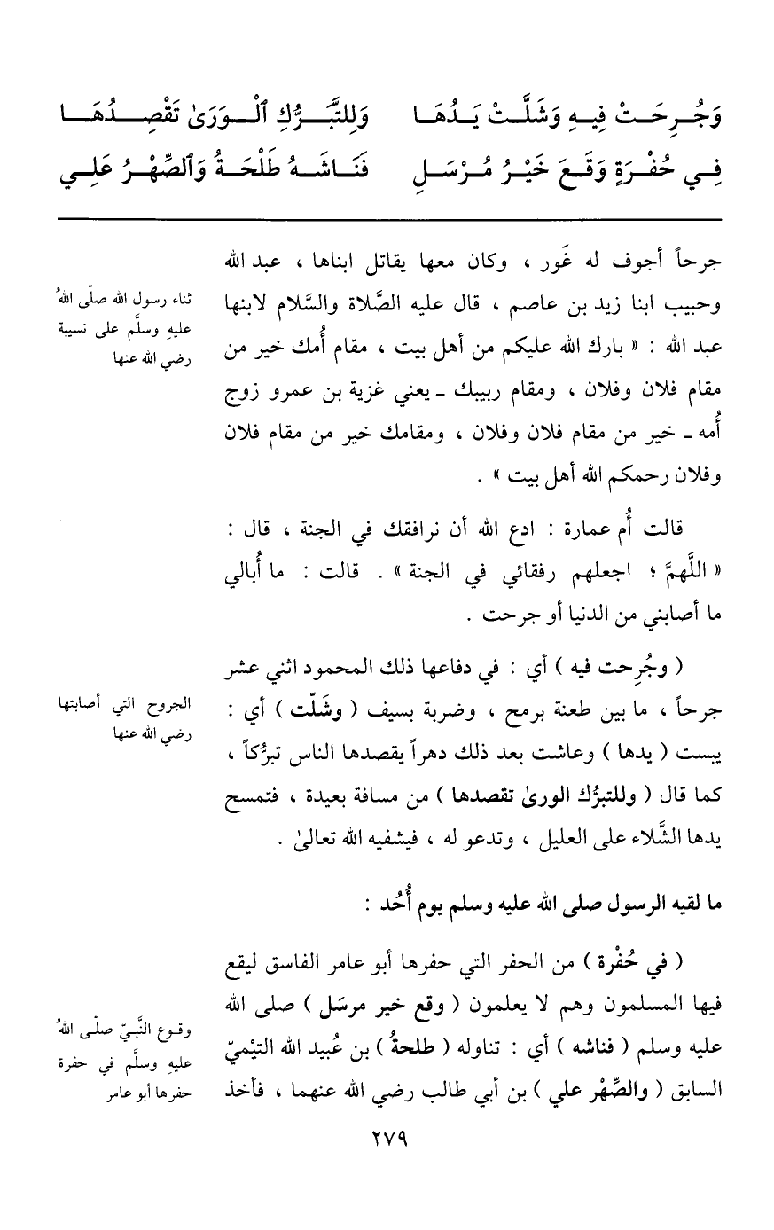جرحا أجوف له غور، وكان معها يقاتل ابناها، عبد الله وحبيب ابنا زيد بن عاصم، قال عليه الصّلاة والسّلام لابنها عبد الله: «بارك الله عليكم من أهل بيت، مقام أمك خير من مقام فلان وفلان، ومقام ربيبك- يعني غزية بن عمرو زوج أمه- خير من مقام فلان وفلان، ومقامك خير من مقام فلان وفلان رحمكم الله أهل بيت» .