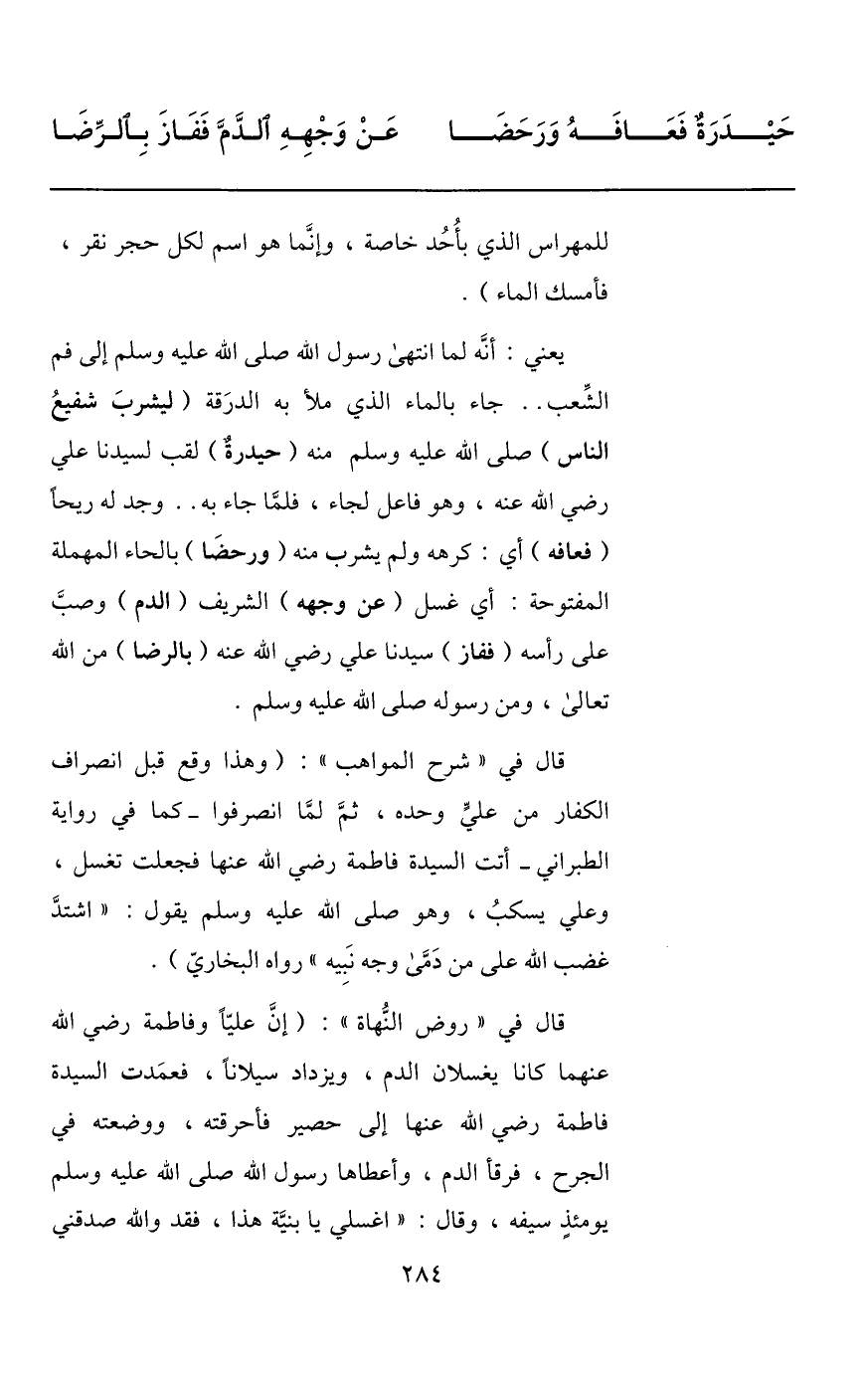 يعني: أنّه لما انتهى رسول الله صلى الله عليه وسلم إلى فم الشّعب.. جاء بالماء الذي ملأ به الدرقة (ليشرب شفيع الناس) صلى الله عليه وسلم منه (حيدرة) لقب لسيدنا علي رضي الله عنه، وهو فاعل لجاء، فلمّا جاء به.. وجد له ريحا (فعافه) أي: كرهه ولم يشرب منه (ورحضا) بالحاء المهملة المفتوحة: أي غسل (عن وجهه) الشريف (الدم) وصبّ على رأسه (ففاز) سيدنا علي رضي الله عنه (بالرضا) من الله تعالى، ومن رسوله صلى الله عليه وسلم.