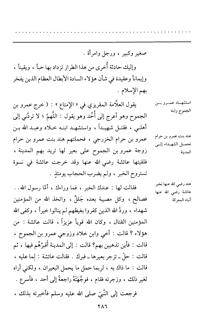 يقول العلّامة المقريزي في «الإمتاع» : (خرج عمرو بن الجموح وهو أعرج إلى أحد وهو يقول: اللهمّ؛ لا تردّني إلى أهلي، فقتل شهيدا، واستشهد ابنه خلاد وعبد الله بن عمرو بن حرام الخزرجي، فحملتهم هند بنت عمرو بن حرام زوجة عمرو بن الجموح على بعير لها تريد بهم المدينة، فلقيتها عائشة رضي الله عنها وقد خرجت عائشة في نسوة تستروح الخبر، ولم يضرب الحجاب يومئذ.