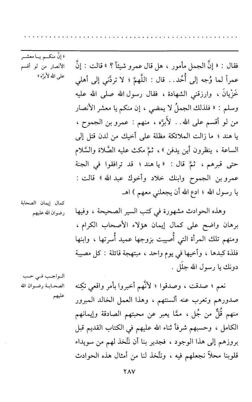 وهذه الحوادث مشهورة في كتب السير الصحيحة، وفيها برهان واضح على كمال إيمان هؤلاء الأصحاب الكرام، ومنهم تلك المرأة التي أصيبت بزوجها عميد أسرتها، وابنها فلذة كبدها، وأخيها في يوم واحد، مبتهجة قائلة: كل مصيبة دونك يا رسول الله جلل.