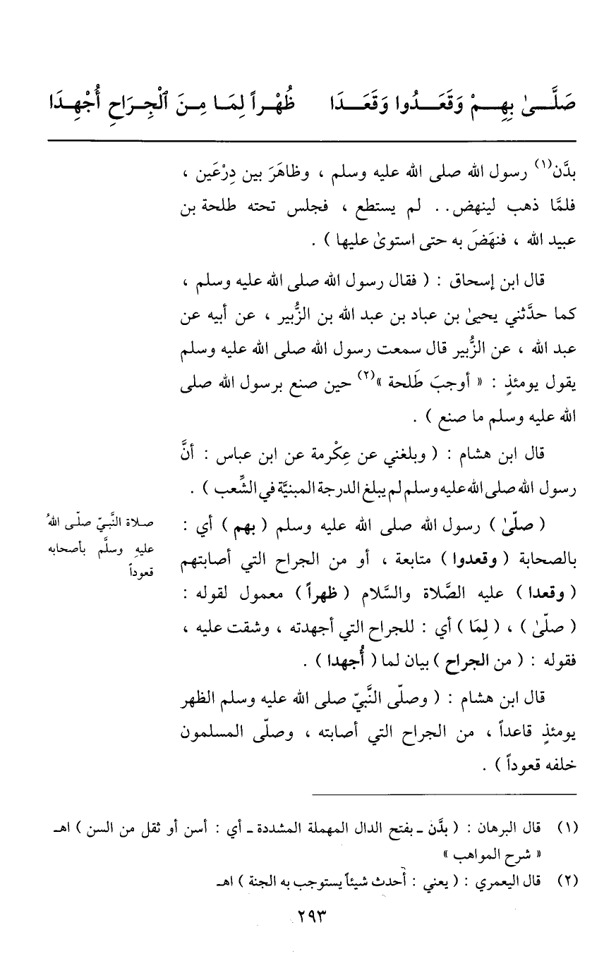 قال ابن هشام: (وصلّى النّبيّ صلى الله عليه وسلم الظهر يومئذ قاعدا، من الجراح التي أصابته، وصلّى المسلمون خلفه قعودا) .