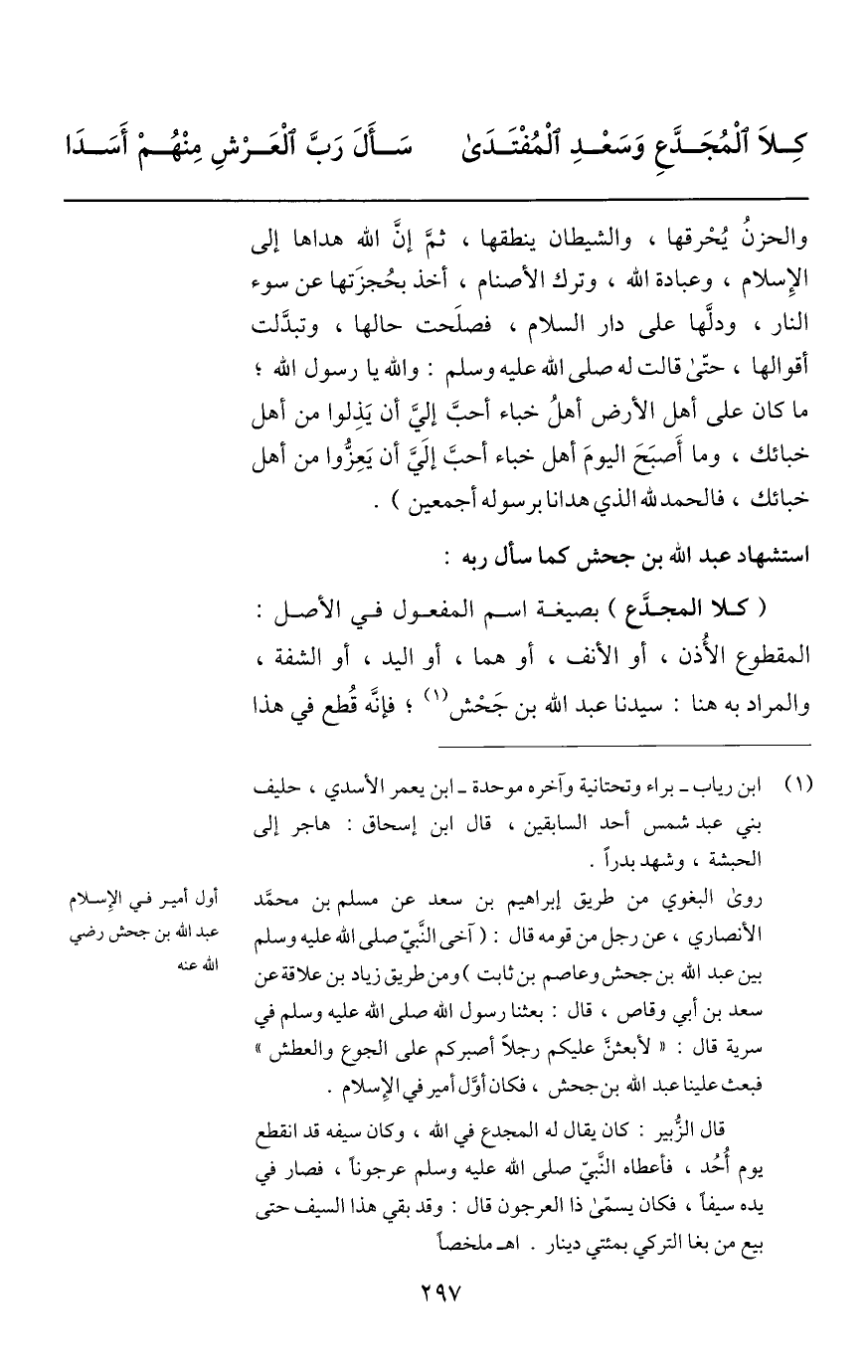 (1) ابن رياب- براء وتحتانية وآخره موحدة- ابن يعمر الأسدي، حليف بني عبد شمس أحد السابقين، قال ابن إسحاق: هاجر إلى الحبشة، وشهد بدرا. روى البغوي من طريق إبراهيم بن سعد عن مسلم بن محمّد الأنصاري، عن رجل من قومه قال: (آخى النّبيّ صلى الله عليه وسلم بين عبد الله بن جحش وعاصم بن ثابت) ومن طريق زياد بن علاقة عن سعد بن أبي وقاص، قال: بعثنا رسول الله صلى الله عليه وسلم في سرية قال: «لأبعثنّ عليكم رجلا أصبركم على الجوع والعطش» فبعث علينا عبد الله بن جحش، فكان أوّل أمير في الإسلام. قال الزّبير: كان يقال له المجدع في الله، وكان سيفه قد انقطع يوم أحد، فأعطاه النّبيّ صلى الله عليه وسلم عرجونا، فصار في يده سيفا، فكان يسمّى ذا العرجون قال: وقد بقي هذا السيف حتى بيع من بغا التركي بمئتي دينار. اهـ ملخصا