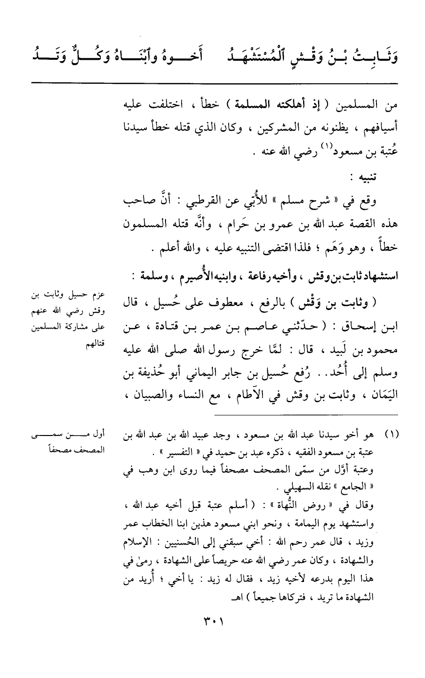 (1) هو أخو سيدنا عبد الله بن مسعود، وجد عبيد الله بن عبد الله بن عتبة بن مسعود الفقيه، ذكره عبد بن حميد في «التفسير» . وعتبة أوّل من سمّى المصحف مصحفا فيما روى ابن وهب في «الجامع» نقله السهيلي. وقال في «روض النّهاة» : (أسلم عتبة قبل أخيه عبد الله، واستشهد يوم اليمامة، ونحو ابني مسعود هذين ابنا الخطاب عمر وزيد، قال عمر رحم الله: أخي سبقني إلى الحسنيين: الإسلام والشهادة، وكان عمر رضي الله عنه حريصا على الشهادة، رمى في هذا اليوم بدرعه لأخيه زيد، فقال له زيد: يا أخي؛ أريد من الشهادة ما تريد، فتركاها جميعا) اهـ