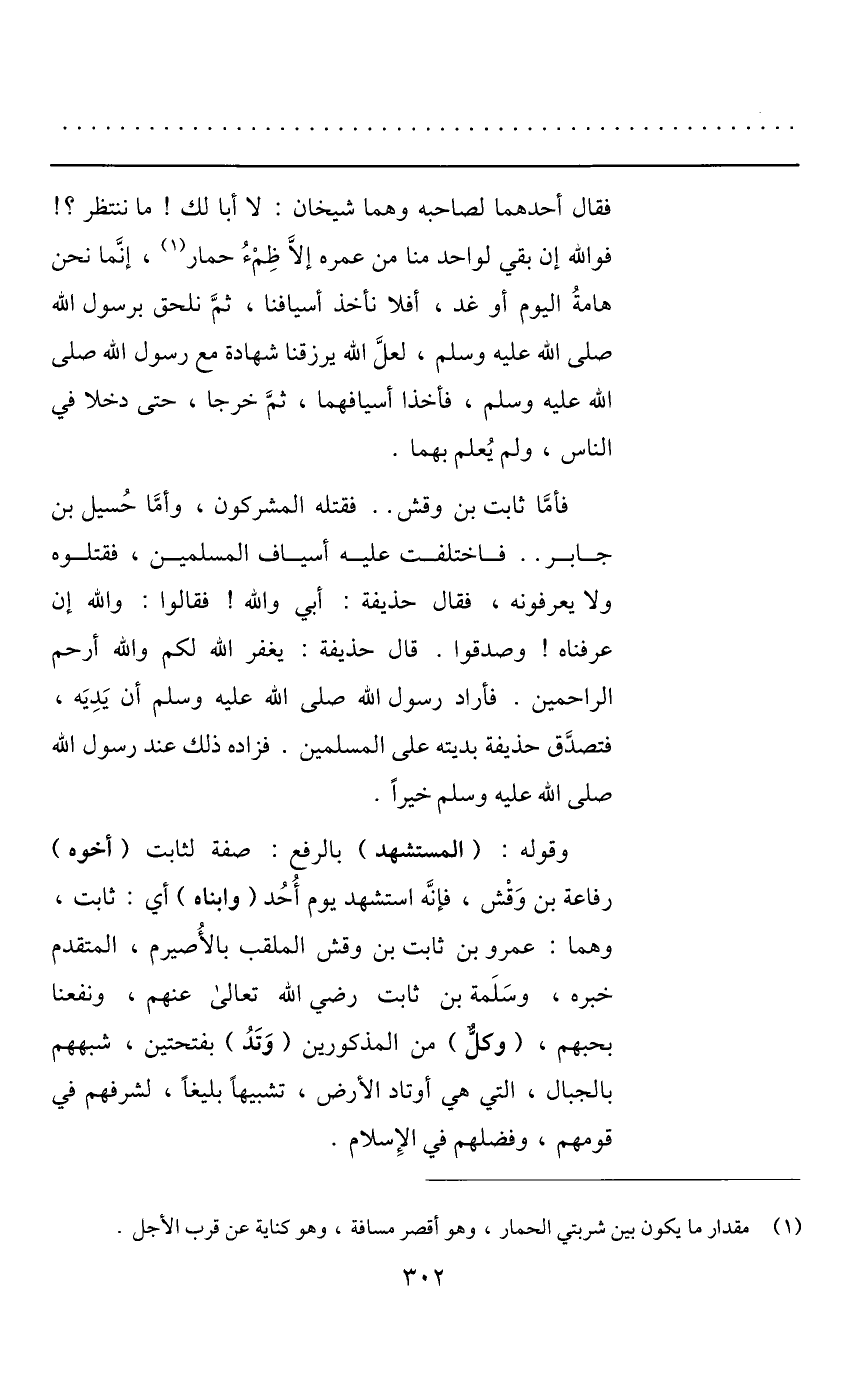 فقال أحدهما لصاحبه وهما شيخان: لا أبا لك! ما ننتظر؟! فوالله إن بقي لواحد منا من عمره إلّا ظمء حمار «1» ، إنّما نحن هامة اليوم أو غد، أفلا نأخذ أسيافنا، ثمّ نلحق برسول الله صلى الله عليه وسلم، لعلّ الله يرزقنا شهادة مع رسول الله صلى الله عليه وسلم، فأخذا أسيافهما، ثمّ خرجا، حتى دخلا في الناس، ولم يعلم بهما.