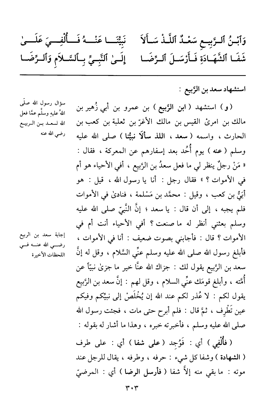 (و) استشهد (ابن الرّبيع) بن عمرو بن أبي زهير بن مالك بن امرئ القيس بن مالك الأغرّ بن ثعلبة بن كعب بن الحارث، واسمه (سعد، اللذ سألا نبيّنا) صلى الله عليه وسلم (عنه) يوم أحد بعد إسفارهم عن المعركة، فقال: