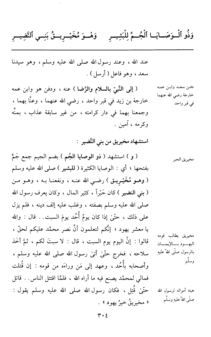 (و) استشهد (ذو الوصايا الجم) بضم الجيم جمع جمّ بفتحها؛ أي: الوصايا الكثيرة (للبشير) صلى الله عليه وسلم (وهو مخيريق) رضي الله عنه، ونفعنا به، وهو من (بني النضير) كان حبرا، كثير المال، وكان يعرف رسول الله صلى الله عليه وسلم بصفته، وغلب عليه إلف دينه، فلم يزل على ذلك، حتّى إذا كان يوم أحد يوم السبت.. قال: والله يا معشر يهود؛ إنّكم لتعلمون أنّ نصر محمّد عليكم لحقّ، قالوا: إنّ اليوم يوم السبت، قال: لا سبت لكم، ثمّ أخذ سلاحه، فخرج حتّى أتى رسول الله صلى الله عليه وسلم، وأصحابه بأحد، وعهد إلى من وراءه من قومه: إن قتلت فمالي لمحمّد يصنع فيه ما أراه الله، فلمّا اقتتل الناس.. قاتل حتّى قتل، فكان رسول الله صلى الله عليه وسلم يقول: