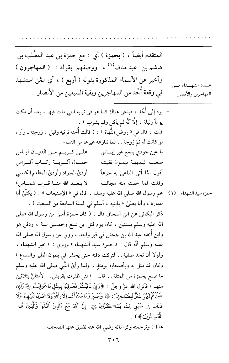 (1) عم رسول الله صلى الله عليه وسلم، قال في «الإستيعاب» : (يكنّى أبا عمارة، وأبا يعلى؛ بابنيه، أسلم في السنة السابعة من المبعث) . ذكر البكائي عن ابن أسحاق قال: (كان حمزة أسن من رسول الله صلى الله عليه وسلم بسنتين، كان يوم قتل ابن تسع وخمسين سنة، ودفن هو وابن أخته عبد الله بن جحش في قبر واحد، روي عن رسول الله صلى الله عليه وسلم أنّه قال: «حمزة سيد الشهداء» وروي: «خير الشهداء، ولولا أن تجد صفية.. لتركت دفنه حتى يحشر في بطون الطير والسباع» وكان قد مثل به وبأصحابه يومئذ، ولما رأى النّبي صلى الله عليه وسلم ما صنع بحمزة من المثلة.. قال: «لئن ظفرت بقريش.. لأمثلنّ بثلاثين منهم» فأنزل الله عزّ وجلّ: وَإِنْ عاقَبْتُمْ فَعاقِبُوا بِمِثْلِ ما عُوقِبْتُمْ بِهِ وَلَئِنْ صَبَرْتُمْ لَهُوَ خَيْرٌ لِلصَّابِرِينَ* وَاصْبِرْ وَما صَبْرُكَ إِلَّا بِاللَّهِ وَلا تَحْزَنْ عَلَيْهِمْ وَلا تَكُ فِي ضَيْقٍ مِمَّا يَمْكُرُونَ* إِنَّ اللَّهَ مَعَ الَّذِينَ اتَّقَوْا وَالَّذِينَ هُمْ مُحْسِنُونَ) . هذا: وترجمته وكراماته رضي الله عنه تضيق عنها الصحف.