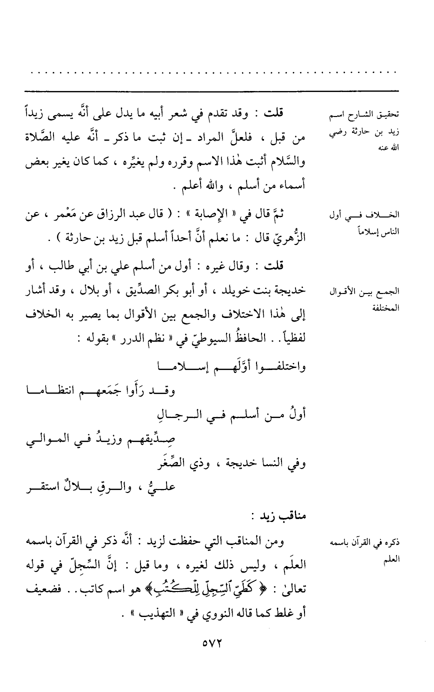 قلت: وقال غيره: أول من أسلم علي بن أبي طالب، أو خديجة بنت خويلد، أو أبو بكر الصدّيق، أو بلال، وقد أشار إلى هذا الاختلاف والجمع بين الأقوال بما يصير به الخلاف لفظيا.. الحافظ السيوطيّ في «نظم الدرر» بقوله: