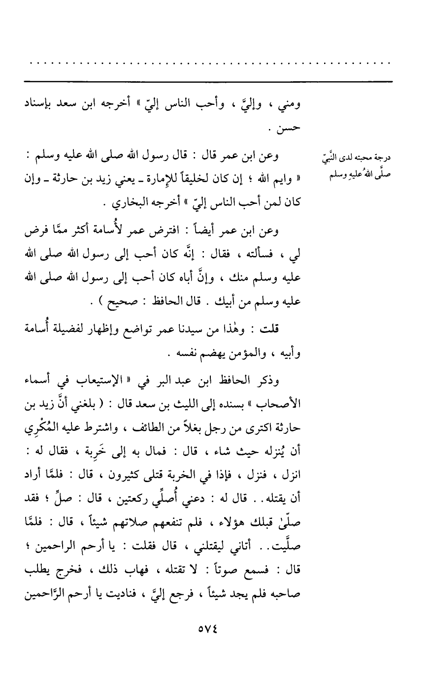 وعن ابن عمر أيضا: افترض عمر لأسامة أكثر ممّا فرض لي، فسألته، فقال: إنّه كان أحب إلى رسول الله صلى الله عليه وسلم منك، وإنّ أباه كان أحب إلى رسول الله صلى الله عليه وسلم من أبيك. قال الحافظ: صحيح) .