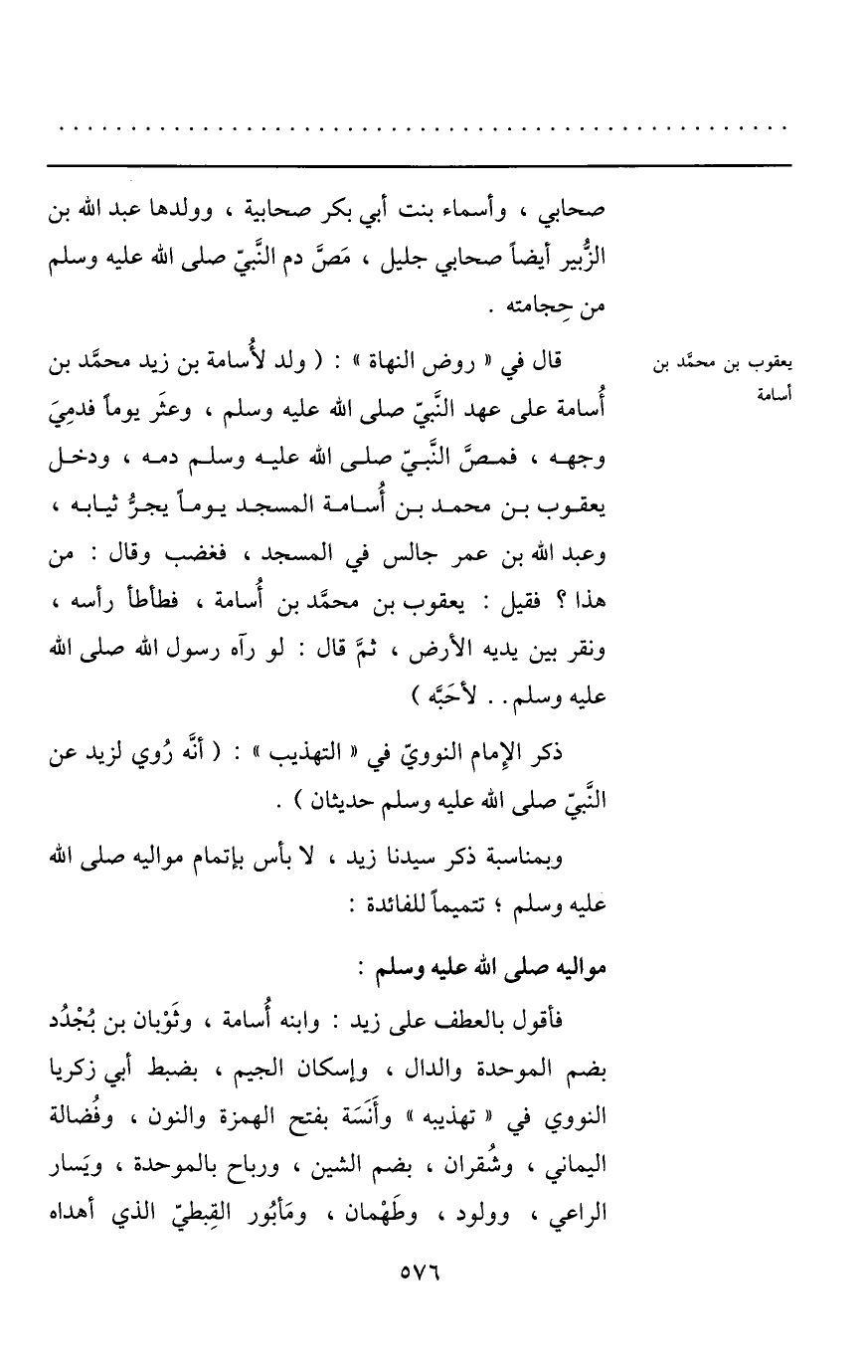 قال في «روض النهاة» : (ولد لأسامة بن زيد محمّد بن أسامة على عهد النّبيّ صلى الله عليه وسلم، وعثر يوما فدمي وجهه، فمصّ النّبيّ صلى الله عليه وسلم دمه، ودخل يعقوب بن محمد بن أسامة المسجد يوما يجرّ ثيابه، وعبد الله بن عمر جالس في المسجد، فغضب وقال: من هذا؟ فقيل: يعقوب بن محمّد بن أسامة، فطأطأ رأسه، ونقر بين يديه الأرض، ثمّ قال: لو رآه رسول الله صلى الله عليه وسلم.. لأحبّه)